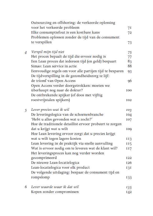 In dit boek gaan Womack en Jones hier uitgebreid op in. Ze beginnen met de blik te verbreden van productie (de focus van veel verbeterinitiatieven) naar consumptie, dus vanuit het oogpunt van de klant. Vervolgens formuleren ze een aantal principes vanuit het oogpunt van de klant. Elk van die principes wordt behandeld in zijn eigen hoofdstuk, en geïllustreerd met echte praktijkvoorbeelden hoe dat vormgegeven is door bepaalde bedrijven. Telkens weer blijkt dat betere klantwaarde samengaat met efficiëntere productie, er is dus geen afweging of trade-off nodig, mits je de juiste Lean-bril opzet. Zo komen ze tot simpele maar revolutionaire ideeën over het leveren van producten en diensten. Enkele inzichten die ze introduceren zijn: