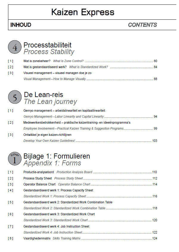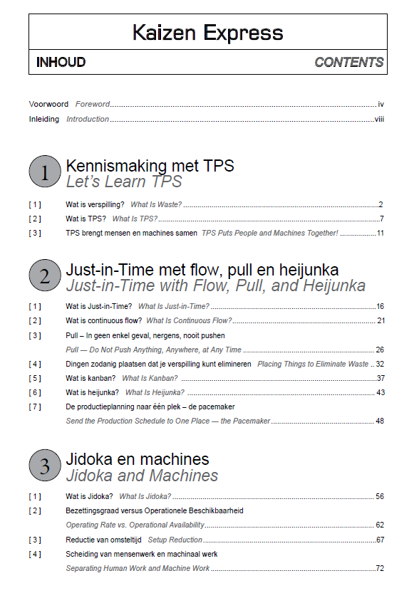 Oorspronkelijk was Kaizen Express ontwikkeld als een hulpmiddel voor het onderwijzen van de essentiële elementen van TPS aan medewerkers die wereldwijd in Japanse fabrieken werkten. Het is tweetalig van opzet (Engels-Nederlands) met vele illustraties op praktisch elke pagina die de kernpunten versterken. In het boek staat ook een samenvatting van TPS-termen in het Nederlands en Japans en een verzameling standaardformulieren die je kunt gebruiken bij het toepassen van Lean.
